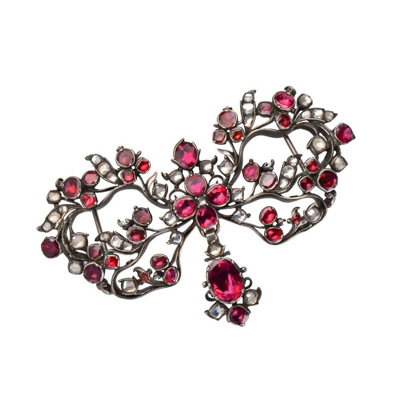 Regal and radiant, almandine (purplish) garnets form flowers and foliate motifs. Rock crystal was faceted to resemble rose cut diamonds and set amid the bevy of color.