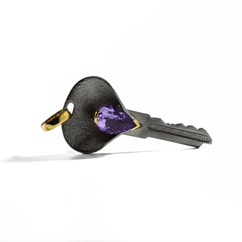 We wonder what doors would you be able to open with these mysterious keys. Let us know, will you?Metal: 925 SilverStones: AmethystPlating: Black Rhodium, 18K GoldWidth 27 mmLength64 mmWeight 11.45 g