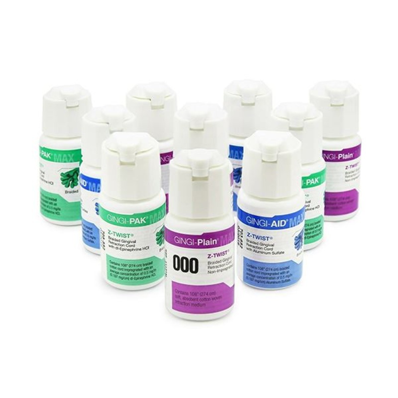Gingi-PakZ-Twist Weave Braided Cord is a fourth-generation, state-of-the-art retraction material manufactured to give dental professionals the characteristics, performance, consistency and reliability they demand. The unique braided construction of 100% cotton Gingi-PakZ-Twist Weave Braided Cord provides excellent, dependable handling characteristics. It packs easily, remains in place, is easily seen in the sulcus and resists penetration by even the smallest packing instruments. Gingi-PakZ-Twist Weave Braided Cord is available as plain cord or hand-impregnated with either dl epinephrine HCL or aluminum sulfate to deliver a consistent 0.5 mg of solution per linear inch of cord throughout its entire length.