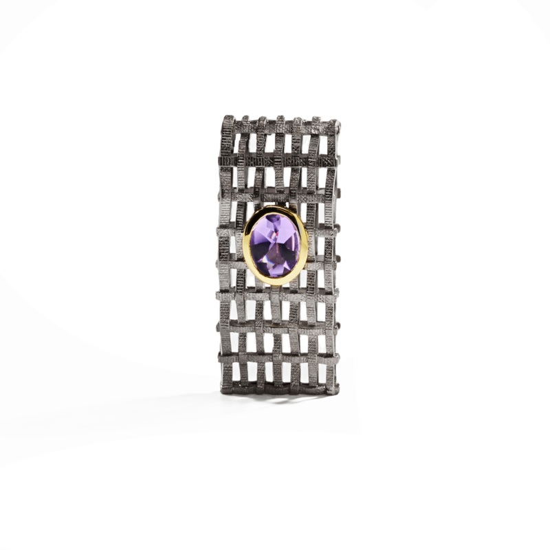 No net ensnares me. No cage can trap me. For you, free spirits.Metal: 925 SilverStones: AmethystPlating: Black Rhodium, 18K GoldWidth20 mmLength45 mmWeight 12.09 g