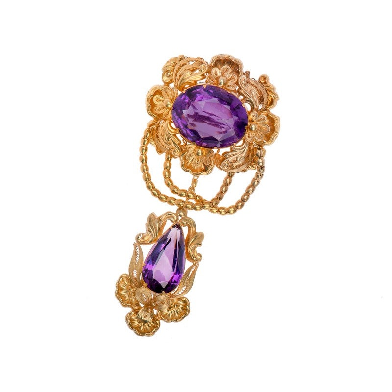 Large in overall scope yet in perfect symmetry, this two-part 20k yellow gold brooch pendant features evocative faceted royal purple amethyst gemstones.