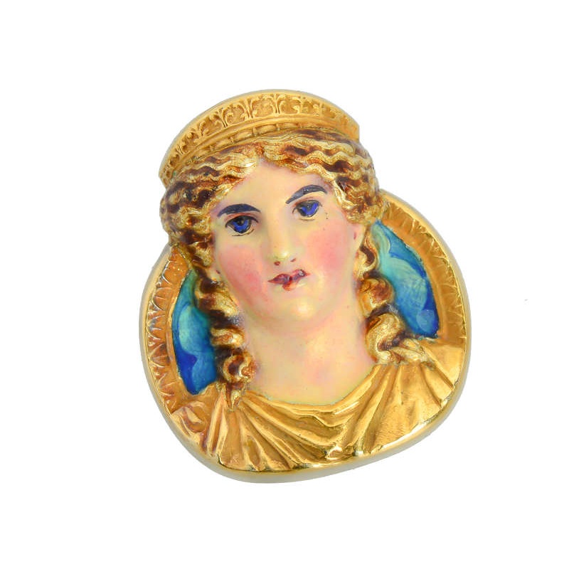 Depicting a goddess in gold toga, her head is crowned with a Grecian style gold tiara. Blue eyes blazing, the entire surface is hand painted in translucent and opaque enamels. Her skin glows with pink and roseate, slightly iridescent enamels.