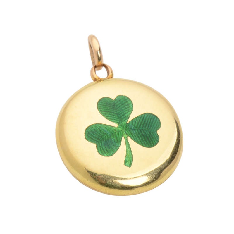 Double good luck, for the exterior, showcases a three-leaf clover in the interior is hand engraved in script, "Good Luck". Enameled over patterned gold, in grassy Kelly green, a lucky three-leaf clover embellishes this 18k gold round locket.Just as the vei