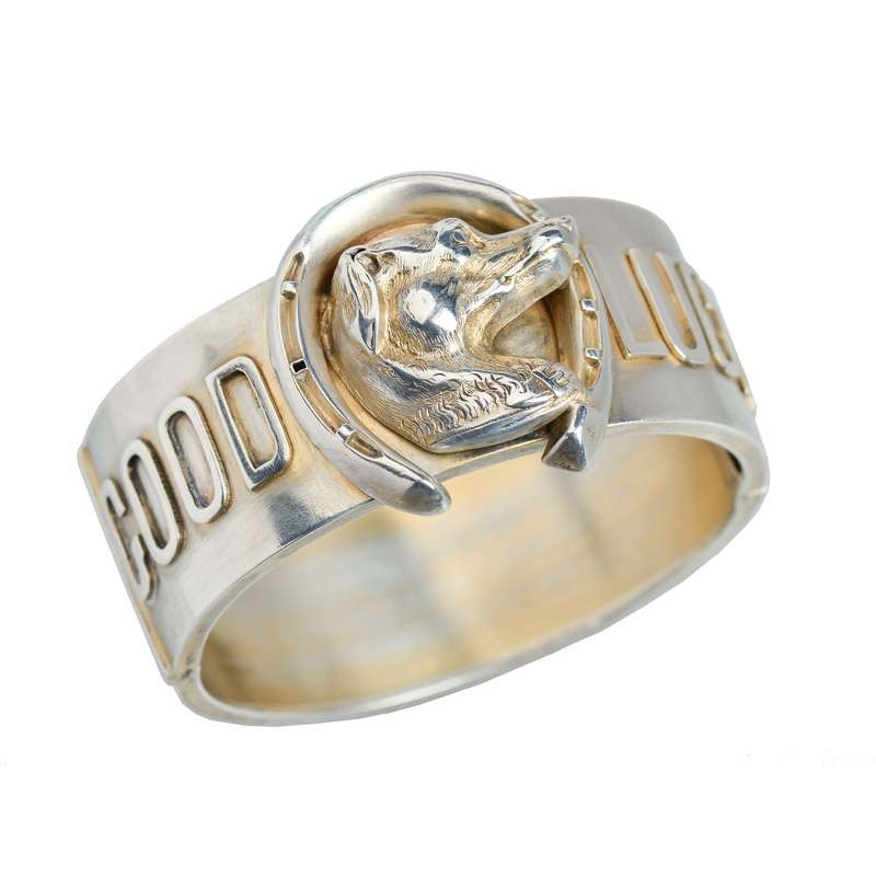 An outstanding late Victorian silver bracelet is the triple crown of adornment. With a sculptural dog's head at the forefront, it is encircled with a horseshoe complete with realistic details. The hound even has a wide collar with a buckle evident at the f