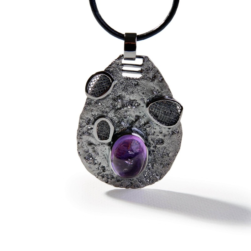 This designer silver pendant showcases an oval cabochon amethyst, radiating natural beauty. The textured surface of the silver with patches of titanium mesh, forms an unexpected marriage of materials, giving rise to an extraordinary fusion that stands alone. Plated with black rhodium, the pendant exudes alluring darkness, creating a striking contrast against the vibrant purple hues of the amethyst.