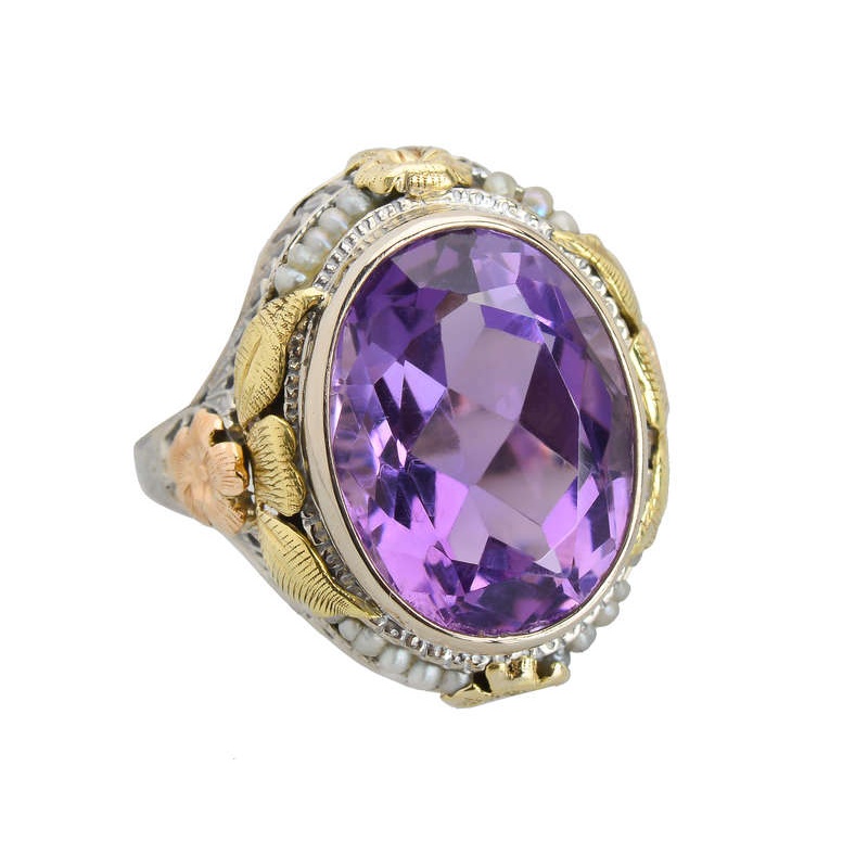 The bezel set beneath it is encircled with petite natural freshwater pearls that are wired between the floral designs. At the base, pierced and open filigree in a lacy array allows light through to bring the gemstone extra refraction.