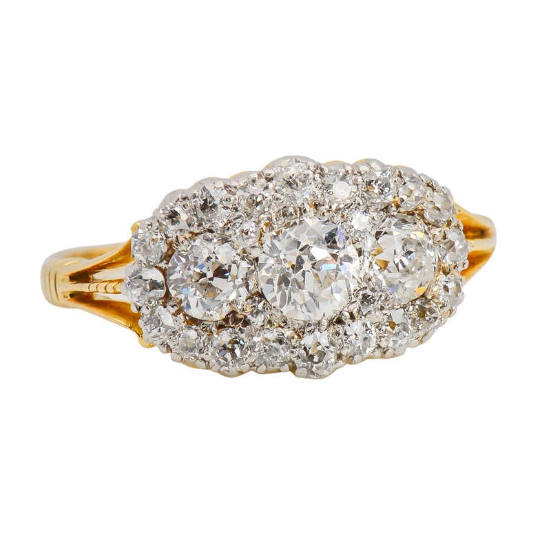 A melding of three central stones, one larger and two graduated down in size, and their skirt of more diamonds, blends in a cohesive whole.