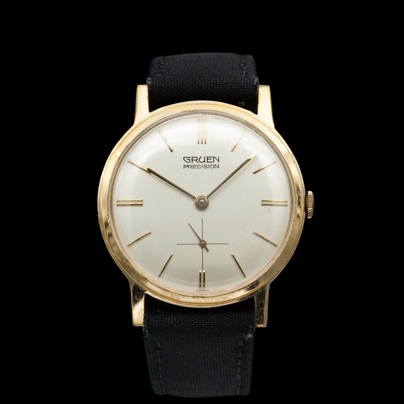 WHAT WE LOVE:Small by today's standards, but the Gruen Precision has a "wrist presence" that belies its 34mm diameter. The dial layout is strong with the applied gold indices mirroring the case. The crystal is significantly domed which adds to the aforemen
