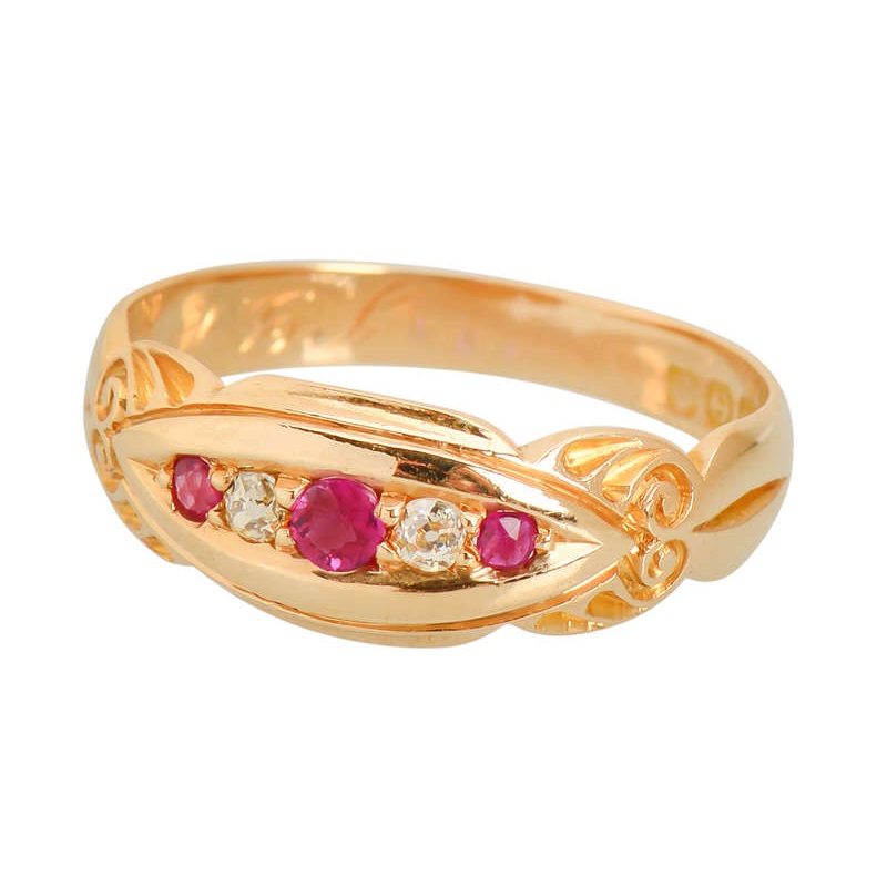 Three natural hot pink and fiery rubies and two old European cut diamonds are arranged in a horizontal row. Gypsy set, they are below the top surface within a marquise shaped cartouche embellished with lyrical carved designs on each side.