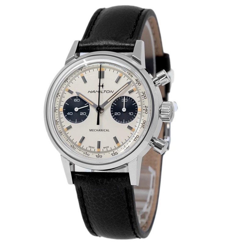American Classic Intra-Matic Chronograph Mechanical 40mmFeel the emotion at the heart of watchmaking with each wind of the Intra-Matic Chronograph H. Powered by our new, exclusive hand-wound chronograph movement the H-51 this is a timepiece with soul. A box-shaped sapphire crystal with double anti-reflective coating protects our signature panda dial, adding another layer of authentic heritage to this mechanical version of a vintage-inspired favorite.TECHNICAL DATABrand: HamiltonFamily: Intra-MaticReference: H38429710Name: Hamilton Men’s H38429710 American Classic Intra-Matic WatchCASEMaterial: SteelGlass: Sapphire GlassDiameter: 40Water Resistance: 10 ATMDIALColor: ChampagneDial Markers: Arabic numeralsBezel: Stainless SteelMOVEMENTType: Manual windingCaliber: Hamilton Caliber H-51Jewels: 27Reserve: 60BANDMaterial: LeatherColor: BlackWidth: 20Clasp: BuckleFUNCTIONSChronograph,TachymeterOTHER FUNCTIONSLuminescent Hands,Luminous indexes