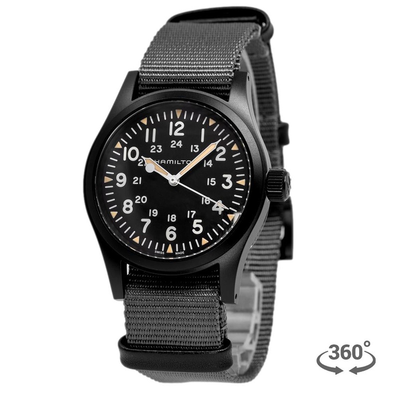Khaki Field MechanicalThe black and gray color scheme of this Khaki Field Mechanical is a subtle approach to military styling. It is powered by the exclusive H-50 handwinding movement which is housed in a 38 mm case. Triangular indexes with old radium colo