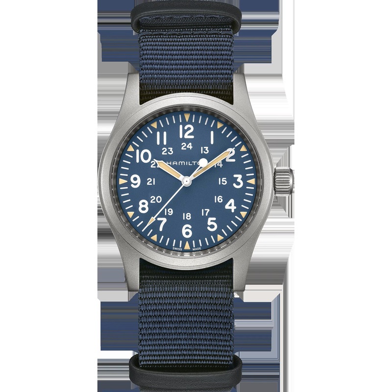 Piccolo ma potente, il Khaki Field Mechanical il compagno ideale per le tue avventure. Racchiuso in una cassa in acciaio da 38 mm, vanta un quadrante blu con vistosi indici bianchi e un rivestimento in super-LumiNova per una leggibilit ottimale. Grazie al resistente cinturino NATO, il Khaki Field Mechanical una riproduzione fedele del suo predecessore degli anni Sessanta e si inserisce alla perfezione nella tradizione militare di Hamilton.