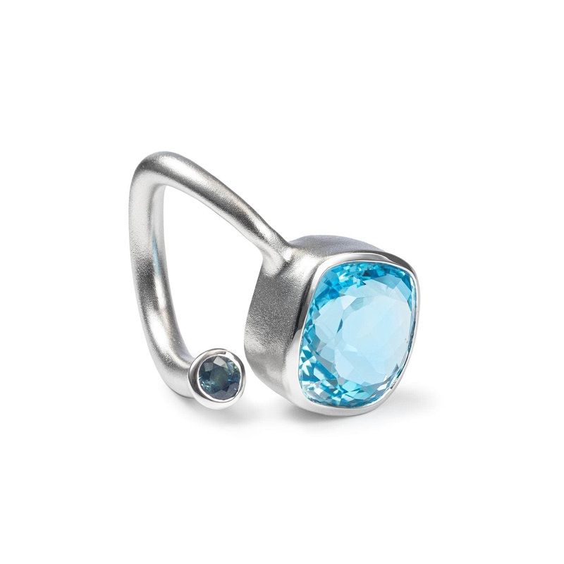 A mirror reflecting your true authentic self, this one-of-a-kind ring features two natural blue gemstonesTopaz and Sapphire. This unconventional pairing symbolizes the contrasts and unity found within every human. Crafted from 925 Silver and plated with Wh