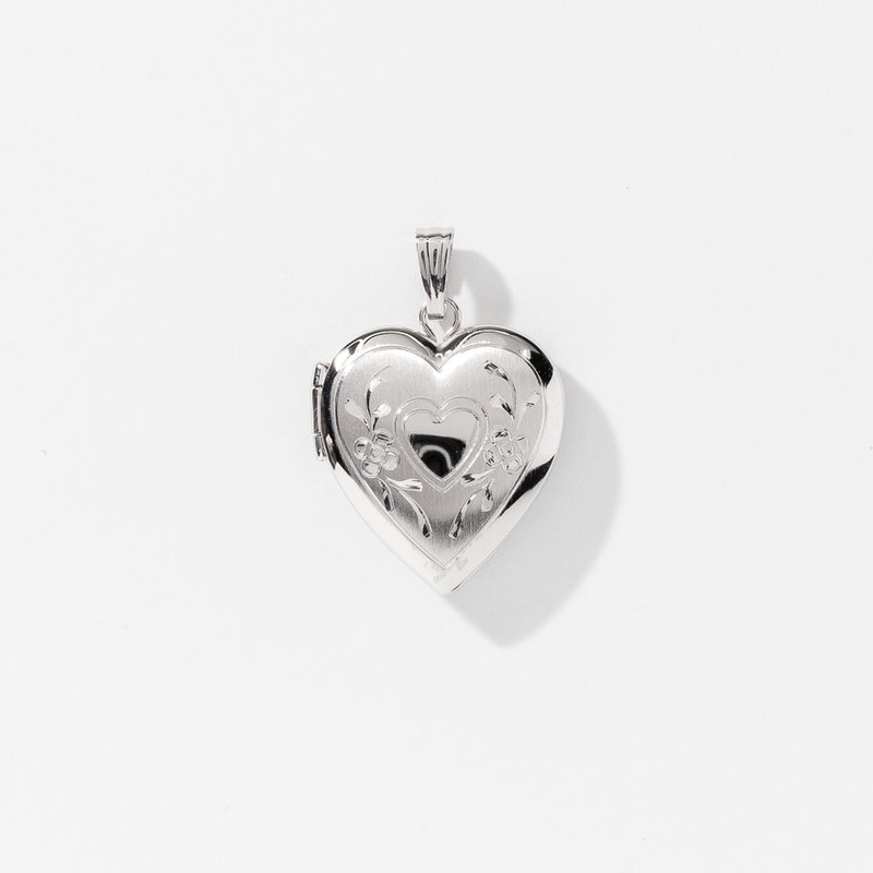 A splendid classic that shell absolutely adore. Finely crafted in 14K white gold, this beautiful heart locket features a floral motif on one side, and it has a polished finish on the other.