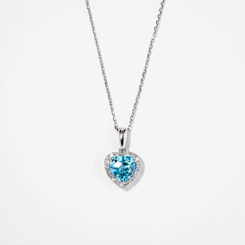 Infuse your jewelry collection with a pop of vibrant color with this exquisite heart-shaped necklace. Crafted in 10K white gold, it showcases a stunning 6×6 blue topaz as its centerpiece, radiating a cool, refreshing hue. It is also adorned with 18 accent diamonds, complementing the gems brilliance.Perfect for any occasion, this necklace is destined to become a cherished favorite.