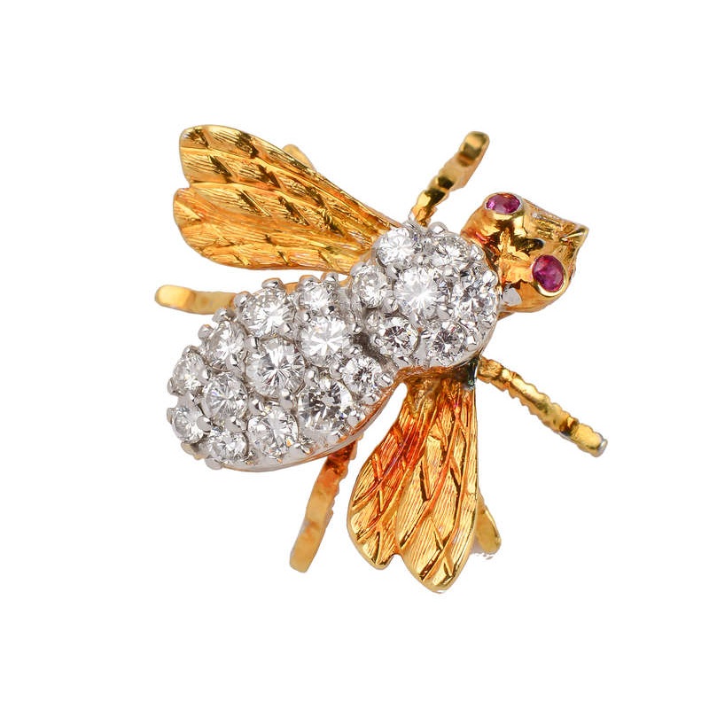 Charming in size, this bee has ruby eyes with a diamond studded body. Nineteen brilliant cut diamonds possess fire and radiance that belies the bee’s relatively modest size. Adding up to 1.10 carats in total, they have a color of G-H, and a clarity of VS (with one at J-K color).