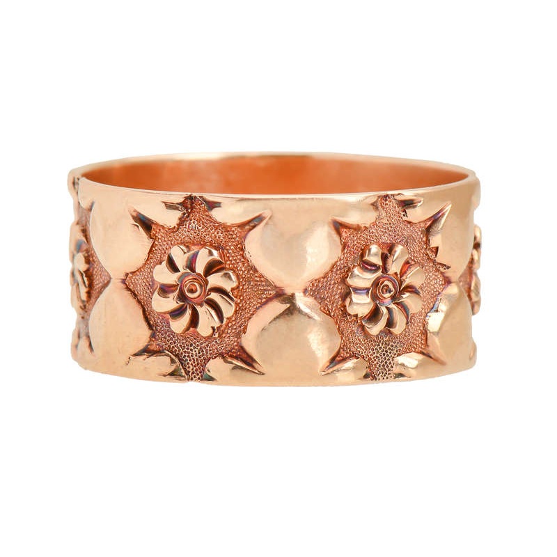 Whether you interpret the design as a sun, an eight-petaled flower, or a radiating star, the motif is evocative and hopeful.Created in 10k rose gold, this wide Victorian wedding band may be worn by a man or woman. Each design of the six is raised and place