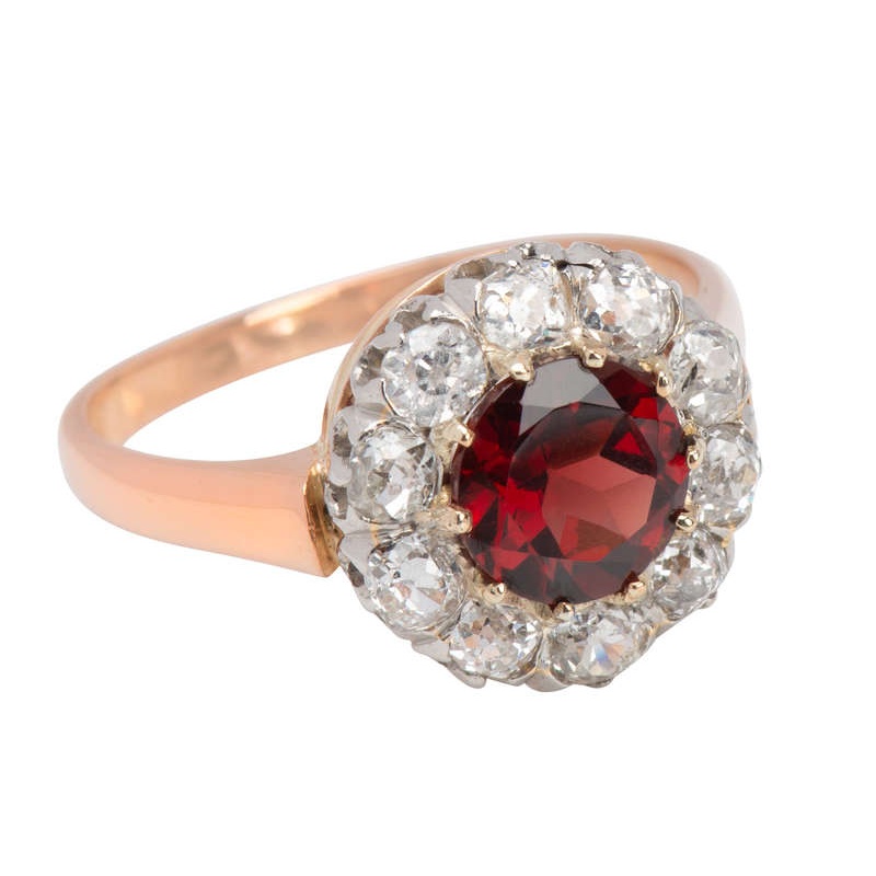 Around the center lie 10 chunky, old mine cut diamonds with as much character as the garnet. A total of 1.3 carats struts their stuff to the tune of color H-I and clarity SI2-I1 (for almost all clear inclusions). Nothing distracts from the glitter and glam.