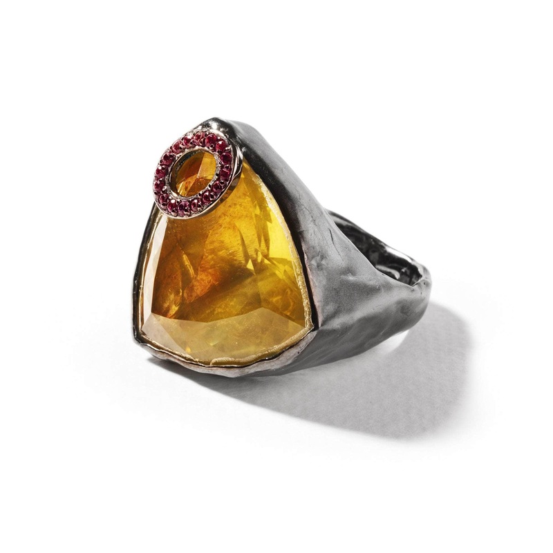 A large trillion-cut lemon quartz steals the spotlight, radiating a vibrant lemon-yellow hue that captivates the beholder. Nestled alongside is a delicate circle of sparkling natural rubies, adding a touch of fiery elegance. This ring serves as a mirror for true egoists, inviting them to gaze upon its beauty and reflect upon themselves. Crafted as a one-of-a-kind creation, this contemporary ring is a singular treasure and a rare collectible.