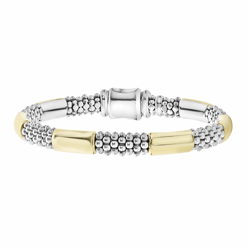 Seven stations of 18K gold surrounded by sterling silver Caviar beading. Finished with double-button signature clasp detailing the LAGOS crest. Ideal to layer with other designs in the High Bar or Signature Caviar collections.