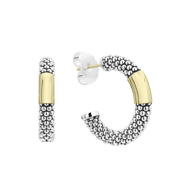 Hoop earrings with smooth 18K gold and sterling silver Caviar beading. Finished with 14k gold post backing.