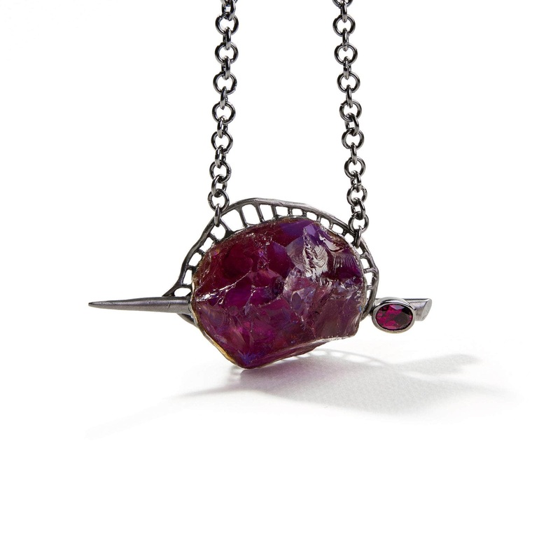 This designer necklace features an oversized amethyst crystal, raw and unapologetic, pierced by a stark silver needle, adorned with perfect oval-cut rhodolite garnet. This piece defies the norm, celebrating the bold harmony of untamed and structured.Metal: