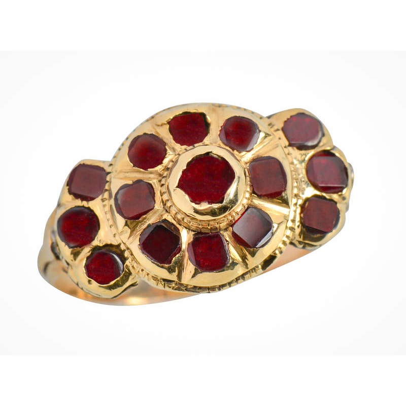 This is a wonderful mid 18th century garnet ring set in 14k gold. A typical style of ring from the Iberian region, there is a central cluster and two “flares” on the sides set with three gemstones each.