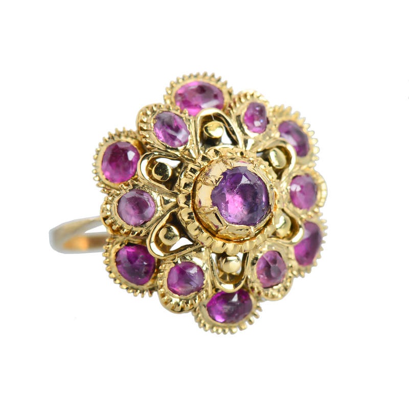 In the Iberian region of Spain and Portugal, a style of ring arose in the 18th century that continued into the 19th. This form is a cluster arranged in tiers or layers of petals of precious metal. In this case 9k yellow gold is artfully arranged in three levels.