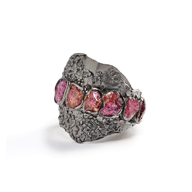Brilliantly bright white rhodium has been crafted into a striking ring. Elemental trims of gold add their yellow light to this organic design. Clustered along the edge are a series of brilliant rough garnets which pulsate with rich pink light as they vibrate on their own unique wavelength.
