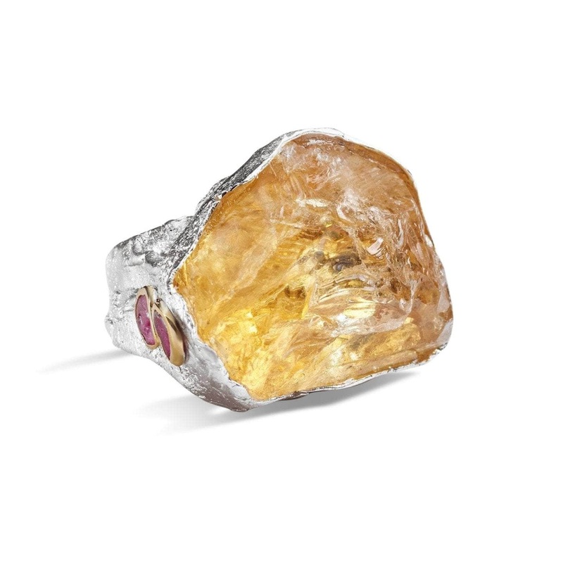 An iridescent citrine pops with bursting life and covers the entire shape of this white rhodium ring. A pair of slice ruby gemstones adorn the sides as the perfect natural addition to this shining palette of color and design.Silver 925Stone Citrine Rough,
