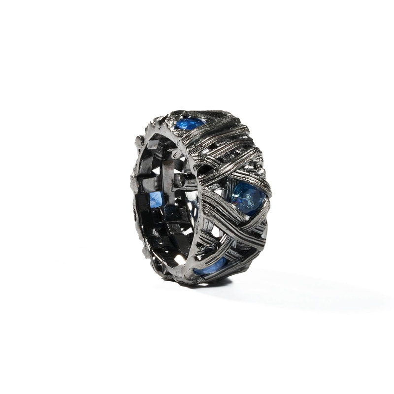 Back and forth through or over. Blue sapphires tangled in a silver ravel with no hope to escape - an inventive way of stone settings denoting the Woven collection. Please remember that this piece is handmade and individually crafted, so your copy might be