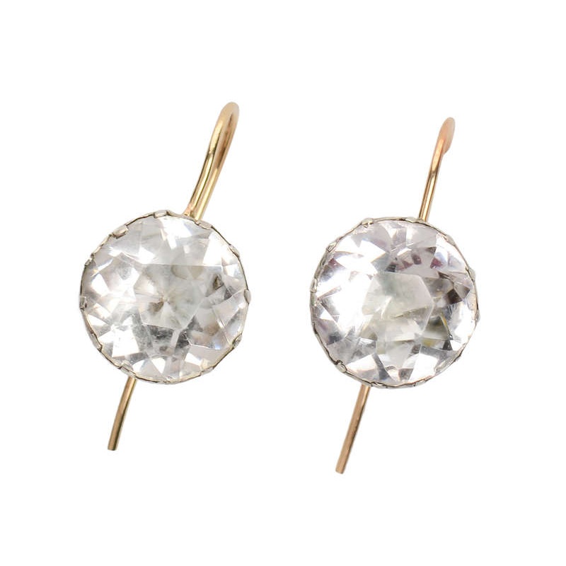 Softly sparkling white pastes have been foiled and set into closed-back and hand-crimped silver cups. Translated into a chic and wearable pair of earrings with the addition of modern 14k yellow gold ear wires, these ear baubles span more than two centuries.