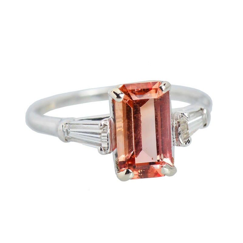 An emerald step cut but is utilized to maximize the high refractive index of topaz, its total weight is 2 carats. At its side rest two tapered baguette diamonds.