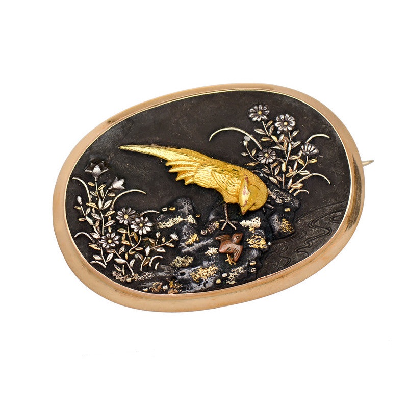 Set into a yellow gold bezel and brooch and pendant fittings, the piece is a reminder of the development of the opening up of Japan for trade during this time span.