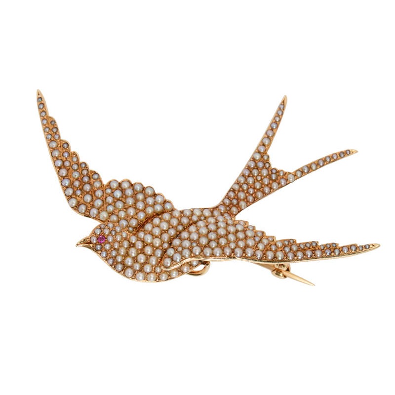 From the firm of Osmun-Parker Mfg. Co, formerly of Newark, New Jersey, comes this outstanding Art Nouveau jewel. Entirely covered in tiny, natural saltwater pearls, its surface is dotted with various sizes of pearls. From just over 1 mm down to teeny tiny, the bird’s wings are a textural lustrous surface. Outstretched, the characteristic swallow’s forked tail stretched behind it.