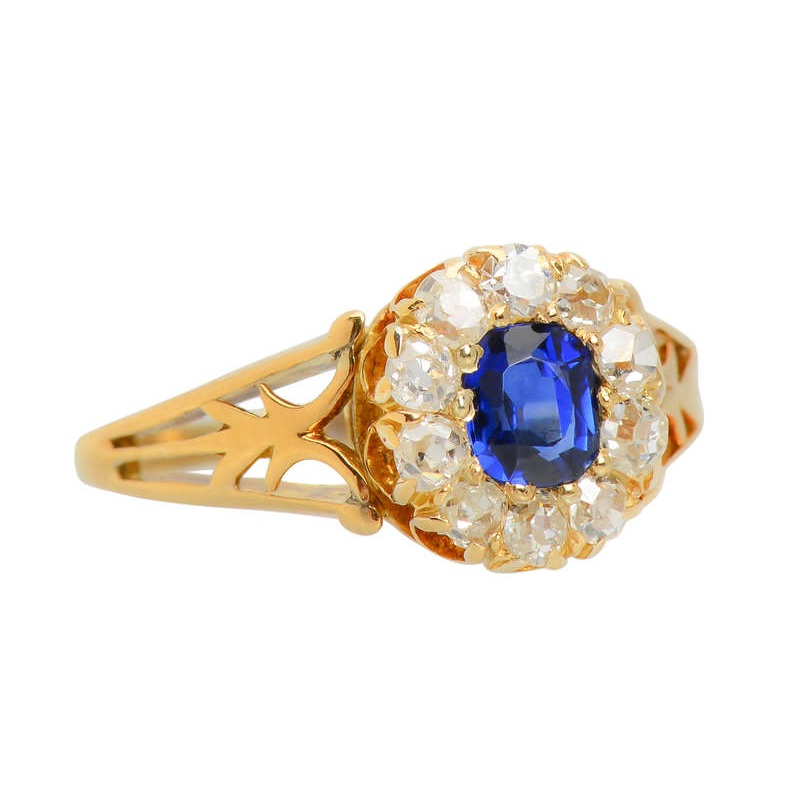 Beautifully set around the sapphire is a halo of 10 old mixed-cut diamonds of .50 carats (I-J color; SI1-3 clarity for clear inclusions) lighting up the vibrant blue stone with fire and glitter.