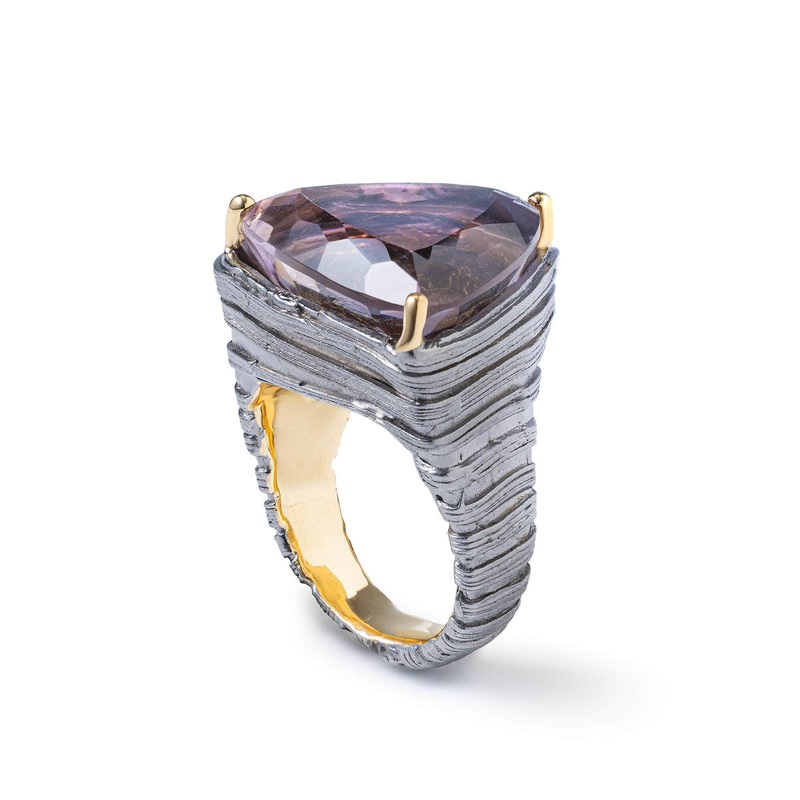 A one-of-a-kind statement ring in 925 sterling silver, plated with Black Rhodium and Gold for bold contrast. It holds an impressive trillion-cut natural Amethyst, rich in color and presence. Designed for those who express themselves unapologeticallywearabl