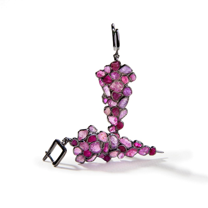 The Iris Rough Pink Sapphire and Ruby Earrings feature rough pink sapphires and rough rubies set in 925 sterling silver, plated with black rhodium for a sleek, modern finish. With a width of 68 mm, length of 23 mm, and a weight of 15.1 g, these earrings ma