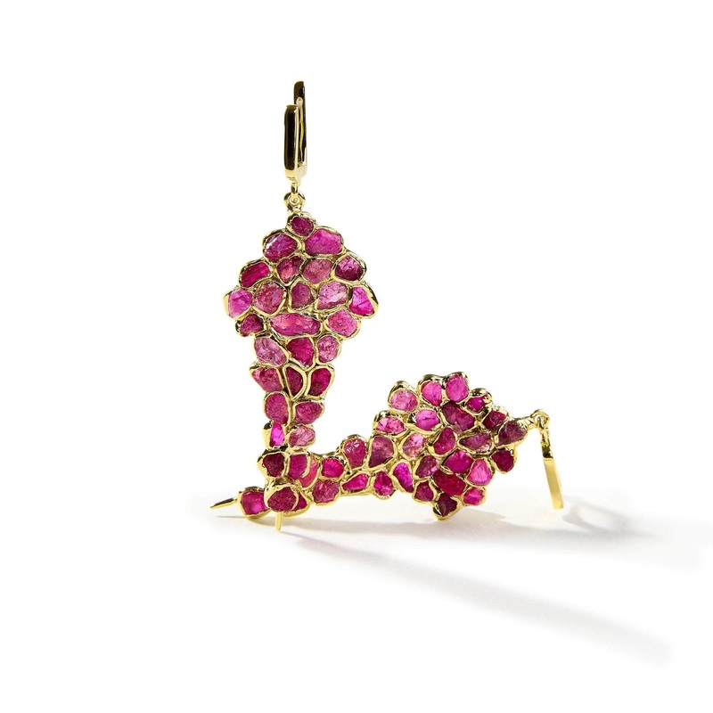 The Ivy Raw Ruby Earrings by are crafted from gold-plated silver and feature a unique raw gemstone setting method. These earrings showcase the untamed beauty of raw rubies, blending natural gemstones with a modern, bold aesthetic. Designed for those who appreciate unconventional jewelry, they celebrate the authenticity of nature and make a striking statement of artistic self-expression. Available in 18K gold, black rhodium, or a distinctive combination of black rhodium and 18K gold, these earrings redefine contemporary jewelry design.
