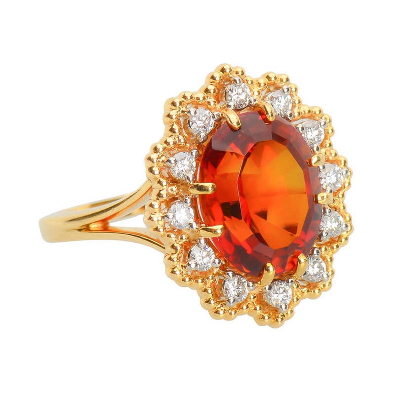 A captivating oval faceted Madeira citrine runs the gamut of hues from butterfly wing orange, ember glow to root beer. At 4.75 carats, and its precise facets, it is a standout among citrines.