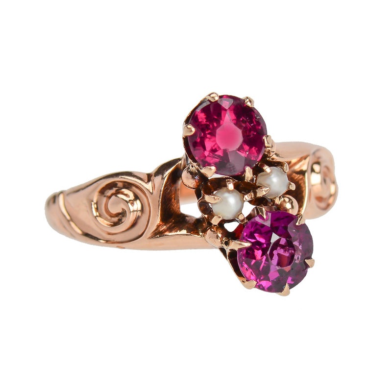 A pair of round faceted almandine garnets each 5 mm in diameter are prong set with a north south diagonal orientation. Intersecting the lusciously hued gems are two half natural freshwater seed pearls.