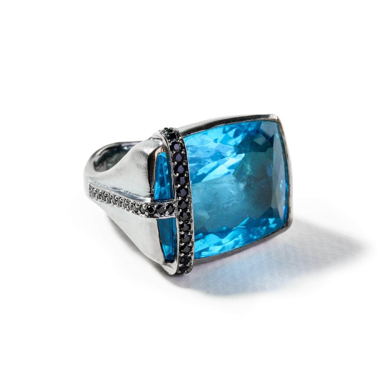 Meet a luminous octagon-cut Swiss Blue Topaz, reminiscent of the deepest oceans, accompanied by a celestial entourage of round-cut Black Spinel melee. This 925 silver ring is the right accessory for brave souls who see the world through the lens of artisti