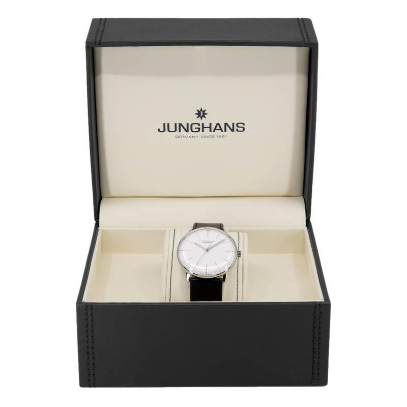 TECHNICAL DATABrand: JunghansFamily: Max Bill AutomaticReference: 27/3501.02Name: Junghans 27/3501.02 Max Bill Auto Sapphire AutoCASEMaterial: SteelGlass: Sapphire GlassDiameter: 38 X 38Case Thickness: 10Water Resistance: 5 ATMDIALColor: WhiteDial Markers: No numeralsBezel: Stainless SteelMOVEMENTType: AutomaticCalieber: AutomaticBase Caliber: J800.1Reserve: 38BANDMaterial: LeatherColor: BlackClasp: BuckleOTHER FUNCTIONSLuminescent Hands,Luminous indexes ,