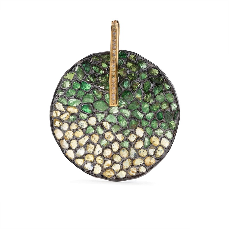 This groundbreaking pendant by transforms conventional jewelry design. Crafted from sterling silver and plated with both black rhodium and 18K gold, it features a gradient of raw green gemstones: deep Chrome Diopside at the top, transitioning to vibrant Ts