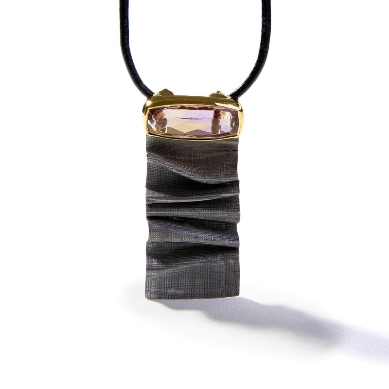 Silver morphs and folds like a delicate textile in his distinct German-Kabirski designer pendant. A rare ametrine gemstone takes center stage, showcasing its extraordinary bicolor nature with gradients of amethyst purple and citrine yellow within a single crystal. The neckpiece is plated in black rhodium and adorned with delicate touches of gold, creating a striking contrast. This singular piece stands alone as an embodiment of artistry, with no second copy in existence.