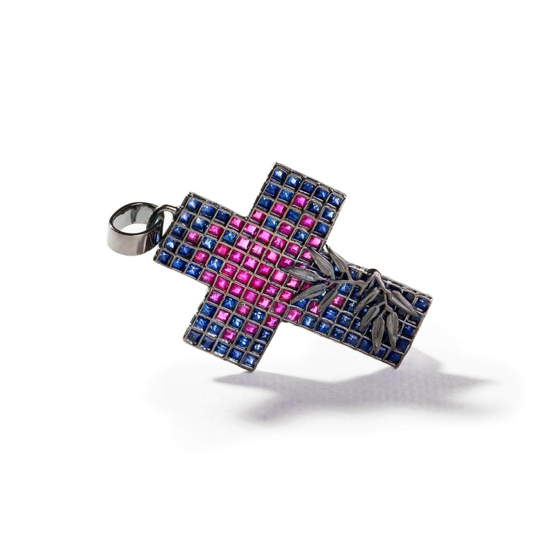 finds joy in the precise geometry of the cross, continuously conjuring up new versions of this offbeat shape. So, here is a new cross-shaped pendant embedded with all-natural, unenhanced princess-cut rubies and sapphires. This singular pendant holds a coll