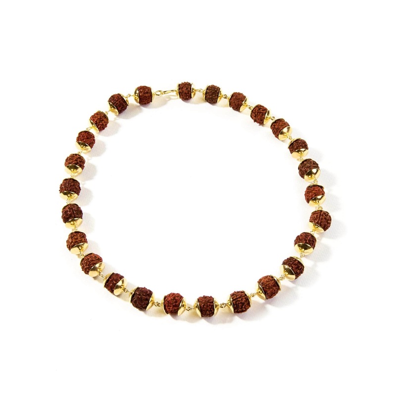 Crafted from organic Rudraksha seeds set in gold-plated silver, this necklace serves as a potent shield against the corrosive forces of the modern world while granting the strength to embrace one's true self. In Hinduism, Rudraksha seeds are revered for th