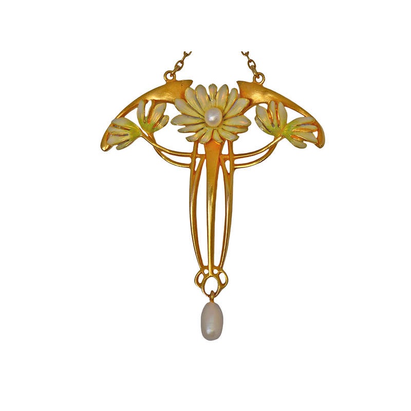 An outstanding example from the Art Nouveau period this pendant necklace utilizes translucent enamel, lotus, and floral motifs, graceful forms, and natural freshwater pearls.
