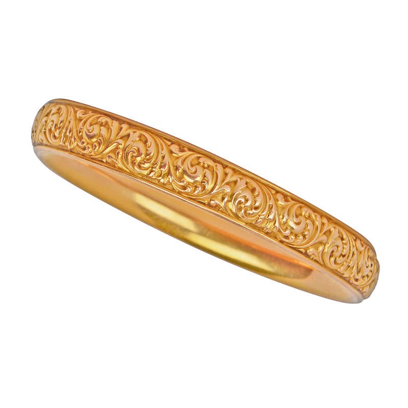 And the surface of a bangle readily lends itself to interpretation by the jewelers of the Art Nouveau period. In repousee relief, all in 14k yellow gold with a rich higher carat appearing finish. The surface is covered entirely, 360 degrees.