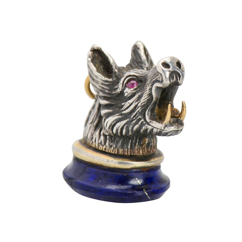 With a lapis lazuli base and its silver and gold boar’s head motif, this is a fob pendant to remember.